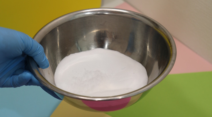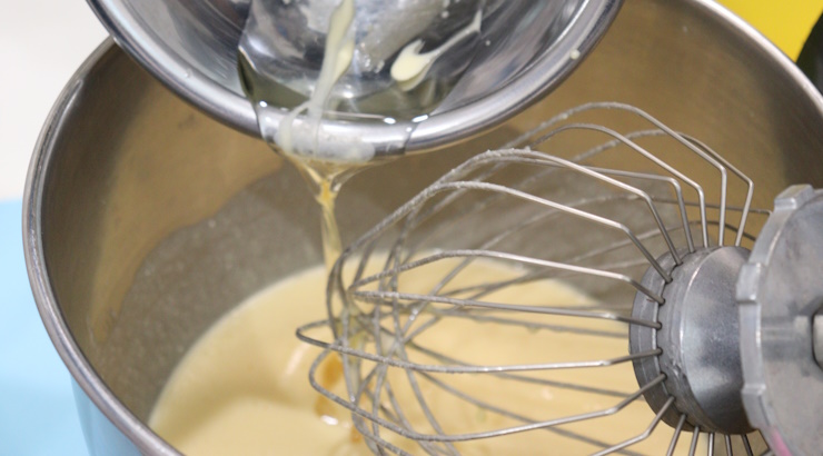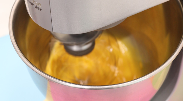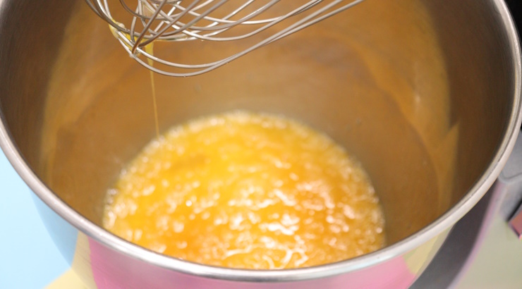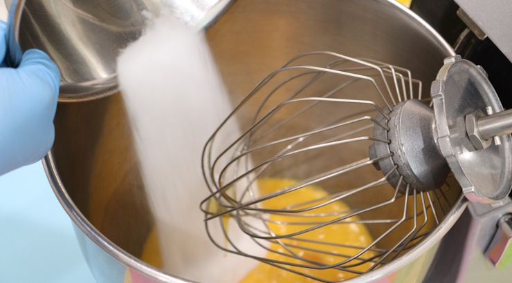 ミキサーボールに全卵を入れてほぐした後、別で混ぜておいたグラニュー糖と塩、乳化剤を入れて泡立たない程度に混ぜます。