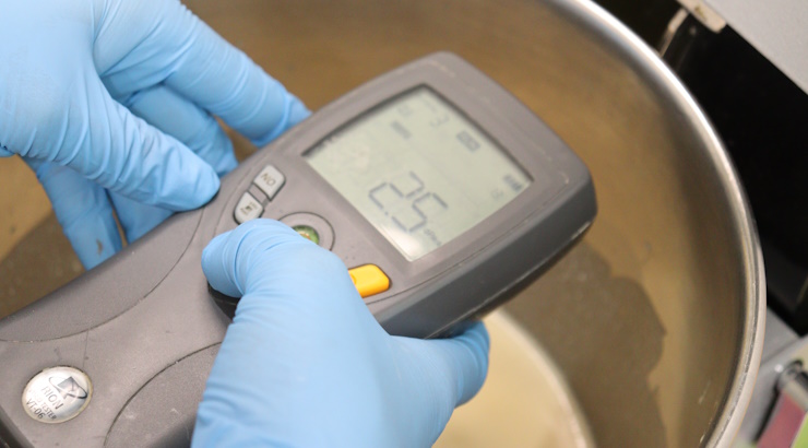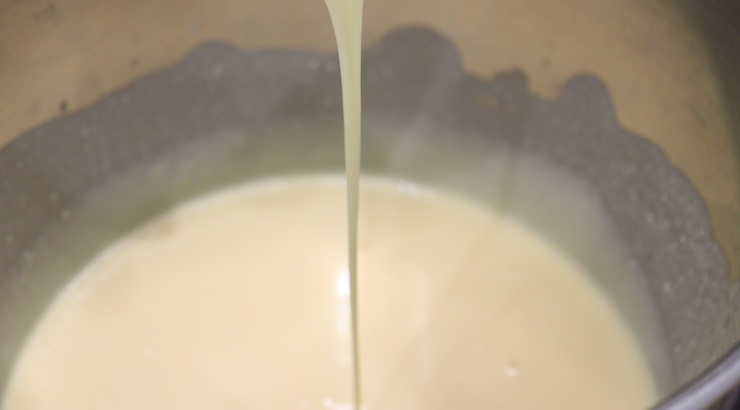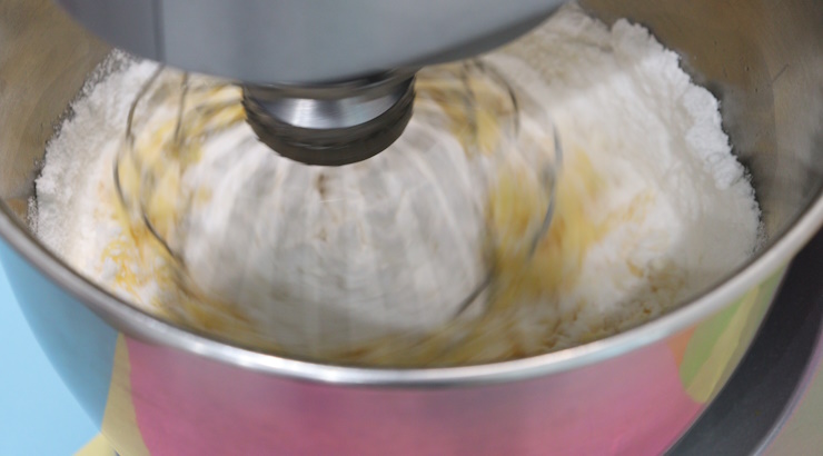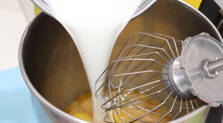 さらに牛乳を入れて混ぜた後、篩った生粉を入れてミキサーにかけます。