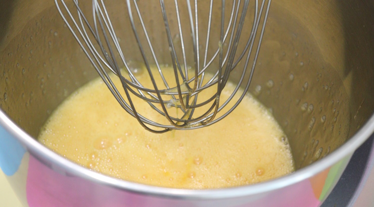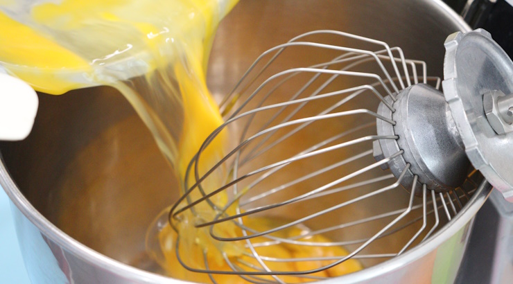 ミキサーボールに全卵を入れてほぐした後、グラニュー糖と乳化剤を入れて高速で混ぜます。