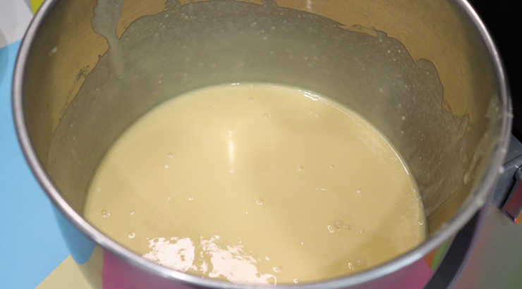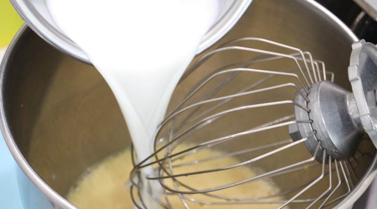 さらに牛乳を入れて混ぜた後、別で混ぜておいた生粉とα化米粉、BPを入れて高速でミキサーにかけ比重を調整します。