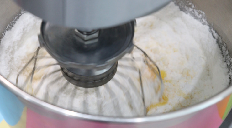 サラダ油を入れて混ぜ、最後に水を入れて粘度を調整したら生地の完成です!