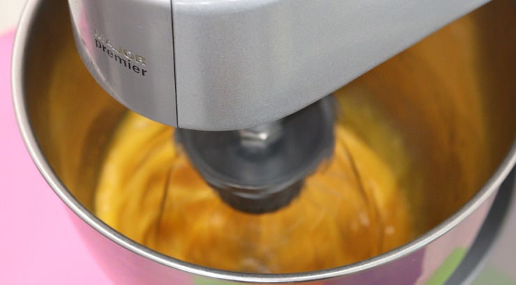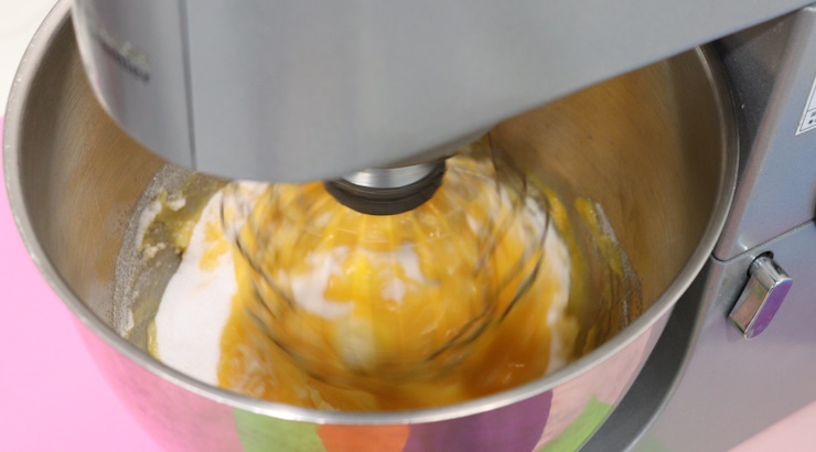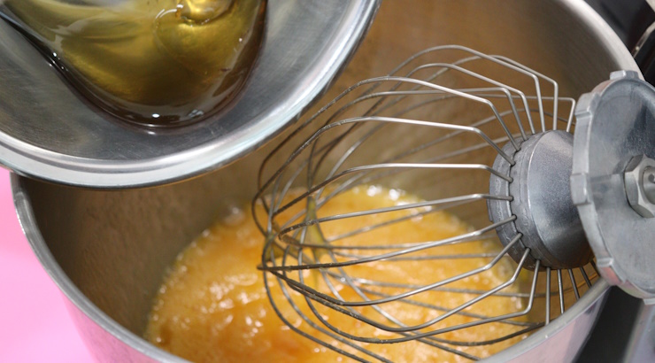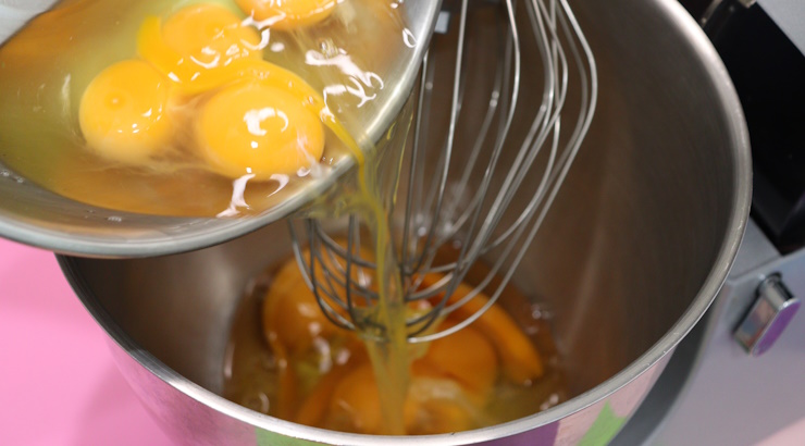 ミキサーボールに全卵を入れてほぐし、グラニュー糖を入れてよく混ぜます。その後、蜂蜜・ケークドールも入れて混ぜます。