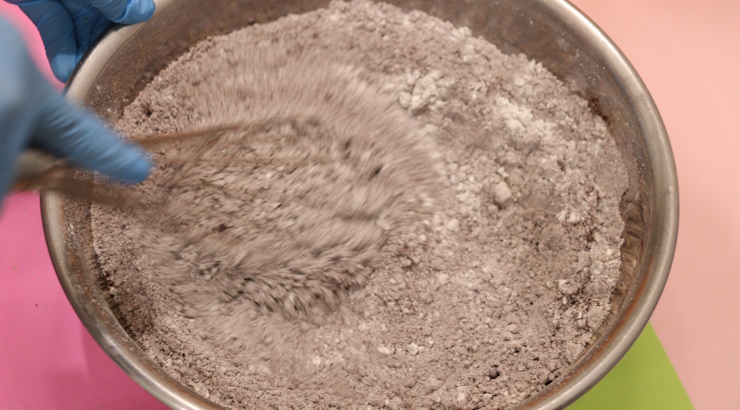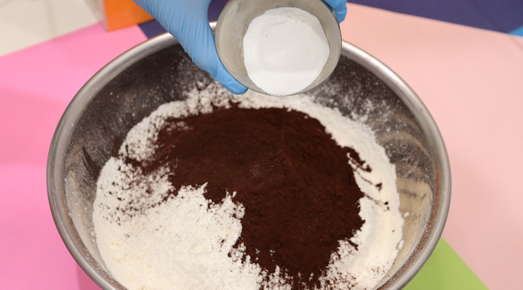 まず別ボールに、ふるった薄力粉、ココアパウダー、BPを入れて粉体混合します。